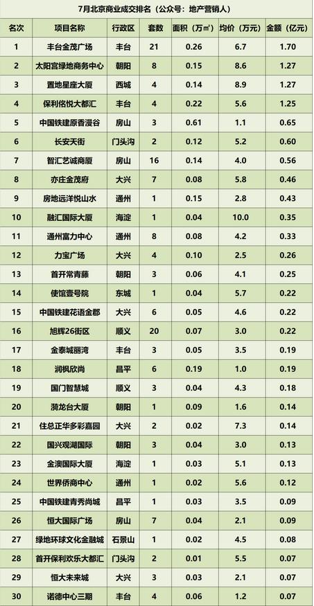 7月,北京商業(yè)市場新增供應(yīng)59套,環(huán)比上漲84%;成交172套,環(huán)比下降39%;成交面積3.21萬㎡,環(huán)比下降17%;成交均價38311元/㎡,環(huán)比上漲15%;成交金額12.3億元,環(huán)比下降5%;目前存量18679套。其中,豐臺金茂廣場以1.7億元的月度成交額位居成交榜首。