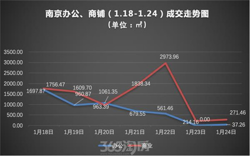 據(jù)南京網(wǎng)上房地產(chǎn)數(shù)據(jù),南京樓市上周(1月18日-1月24日)商業(yè)地產(chǎn)銷售市場共成交面積14625.84㎡,環(huán)比下跌36.89%。其中辦公類產(chǎn)品成交4998.36㎡,環(huán)比上漲45.22%,商鋪類產(chǎn)品成交9627.48㎡,環(huán)比下降51.21%。