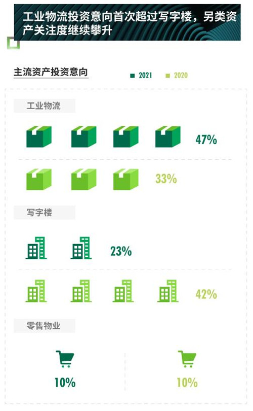 物業(yè)類型方面,得益于疫情中表現(xiàn)極具韌性的租賃表現(xiàn)和可投資高標(biāo)物流設(shè)施體量的快速增長,工業(yè)物流資產(chǎn)成為此次調(diào)查中投資者最關(guān)注的資產(chǎn)類別。同時(shí),作為“新基建”的重要組成部分,倉儲(chǔ)物流被納入中國公募REITS試點(diǎn)的底層資產(chǎn),從而為投資者創(chuàng)造了新的退出/投資渠道。本次調(diào)查顯示寫字樓的投資意愿有所下滑,但仍在主流資產(chǎn)中位居第二。盡管投資者對(duì)短期內(nèi)的新增供應(yīng)高峰仍存顧慮,但核心區(qū)位穩(wěn)定期的寫字樓以及科技企業(yè)集聚的商務(wù)園區(qū)正吸引更多資本的關(guān)注。疫情后,投資者對(duì)另類資產(chǎn)的投資意向進(jìn)一步增強(qiáng),尤其是數(shù)據(jù)中心和冷鏈物流。