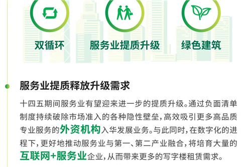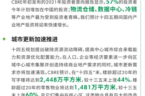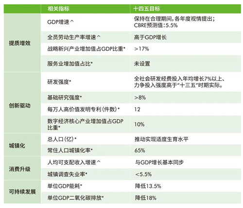 日前,國家“十四五”規(guī)劃綱要全文發(fā)布,再次強(qiáng)調(diào)了經(jīng)濟(jì)提質(zhì)增效、創(chuàng)新驅(qū)動發(fā)展、城鎮(zhèn)化和消費升級、可持續(xù)等重點議題。CBRE世邦魏理仕近日發(fā)表《中國“十四五”規(guī)劃解讀:2021-2025年國家發(fā)展目標(biāo)及其對房地產(chǎn)市場的影響》,梳理未來五年中國主要經(jīng)濟(jì)發(fā)展指標(biāo)和目標(biāo),并提出覆蓋寫字樓、零售物業(yè)、產(chǎn)業(yè)地產(chǎn)、物業(yè)投資等板塊發(fā)展的關(guān)鍵詞。