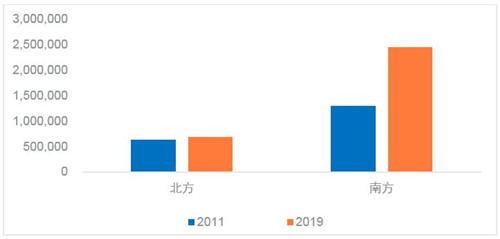 2015年至今,北方經(jīng)濟(jì)對全國經(jīng)濟(jì)的貢獻(xiàn)率逐年下滑,從2015年的43.2%下降至2019年的35.4%,降幅高達(dá)7.8個百分點(diǎn)。2019年,南方省份GDP平均增幅為7.1%,較北方省份高出1.4個百分點(diǎn)。在社會消費(fèi)品零售額方面,2010至2019年,南方省份的社消總額增長迅猛,平均增幅為230%,而北方的平均增幅僅為117.7%。