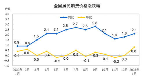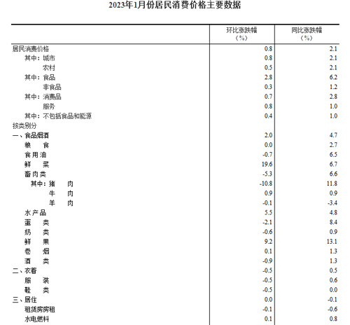 2023年1月份,全國居民消費價格同比上漲2.1%。其中,城市上漲2.1%,農村上漲2.1%;食品價格上漲6.2%,非食品價格上漲1.2%;消費品價格上漲2.8%,服務價格上漲1.0%。