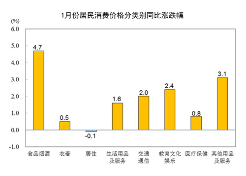 1月份,全國居民消費價格環(huán)比上漲0.8%。其中,城市上漲0.8%,農村上漲0.5%;食品價格上漲2.8%,非食品價格上漲0.3%;消費品價格上漲0.7%,服務價格上漲0.8%。