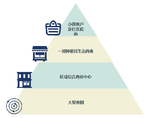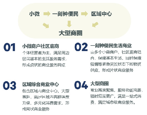 隨著區(qū)域商業(yè)的不斷發(fā)展,區(qū)域商業(yè)能級體系進(jìn)一步得到完善,形成了小微商戶社區(qū)底商—一刻鐘便民商業(yè)—區(qū)域綜合商業(yè)中心—大型商圈的商業(yè)能級體系。