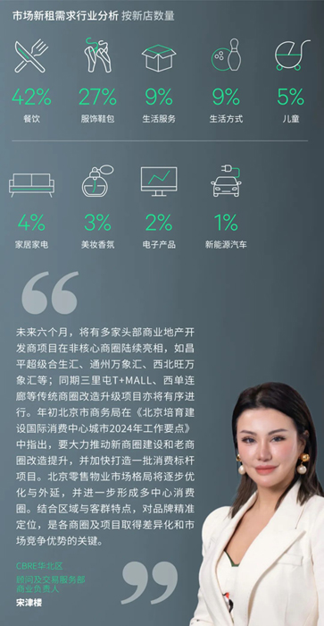 本季度多個(gè)購物中心加大餐飲招商力度以提升客流。由大眾餐飲、烘焙甜品及茶飲果汁為代表的餐飲業(yè)態(tài)繼續(xù)領(lǐng)跑,占據(jù)總新開店鋪數(shù)量的42%,包括湖北菜“楚采”及東南亞料理“曼奈·肉桂廚房”、甜品首店“The Roll’ING瑞士卷”、連鎖咖啡茶飲庫迪旗下新產(chǎn)品線“茶貓”和喜茶首家黑金店等。其次,服飾鞋包等零售業(yè)態(tài)保持穩(wěn)定的擴(kuò)張節(jié)奏并占據(jù)總新開店鋪數(shù)量的27%,核心商圈標(biāo)桿項(xiàng)目由于客流轉(zhuǎn)化率較高而更受新進(jìn)入北京市場的零售品牌青睞,如中國首家安踏作品集白標(biāo)店、潮流女裝One Moment首店、戶外國際品牌Peak Performance分別入駐三里屯太古里南區(qū)、朝外THE BOX和朝陽大悅城。