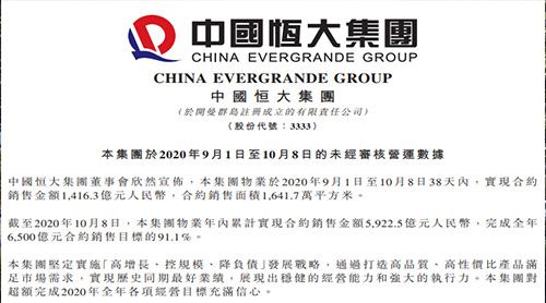 10月9日,中國恒大發(fā)布最新公告,9月1日-10月8日共計(jì)38天,公司累計(jì)實(shí)現(xiàn)銷售1416.3億,創(chuàng)同期歷史新高。截至目前,恒大年內(nèi)已實(shí)現(xiàn)銷售額5922.5億,完成全年6500億銷售目標(biāo)的91%。