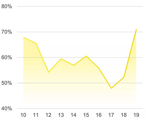 自2018年下半年起,一二線城市一手住宅市場始終維持溫和而穩(wěn)健的態(tài)勢,即使政策層面放松幅度極其微弱,充沛的自住用戶群體帶來韌性需求。