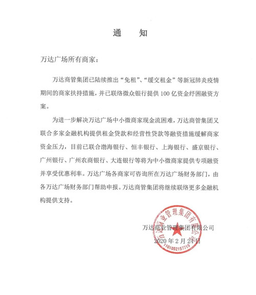 房訊網(wǎng)訊 2月24日,萬達商業(yè)管理集團發(fā)布通知,繼聯(lián)絡微眾銀行提供100億資金紓困融資方案后,萬達商管集團又聯(lián)合多家金融機構(gòu)提供租金貸款和經(jīng)營性貸款等融資措施緩解商家資金壓力,進一步解決萬達廣場中小微商家現(xiàn)金流困難。