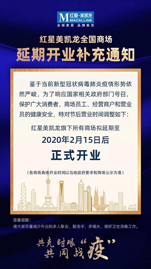 房訊網(wǎng)訊 據(jù)紅星美凱龍官方微信消息,鑒于當(dāng)前新型冠狀病毒疫情形勢(shì)依然嚴(yán)峻,為了響應(yīng)國(guó)家相關(guān)政府部門號(hào)召,保護(hù)廣大消費(fèi)者、商場(chǎng)員工、經(jīng)營(yíng)商戶和營(yíng)業(yè)員的健康安全,紅星美凱龍旗下所有商場(chǎng)將延期至2020年2月15日后正式開業(yè),而各商場(chǎng)具體開業(yè)時(shí)間以當(dāng)?shù)卣蠛蜕虉?chǎng)公示為準(zhǔn)。