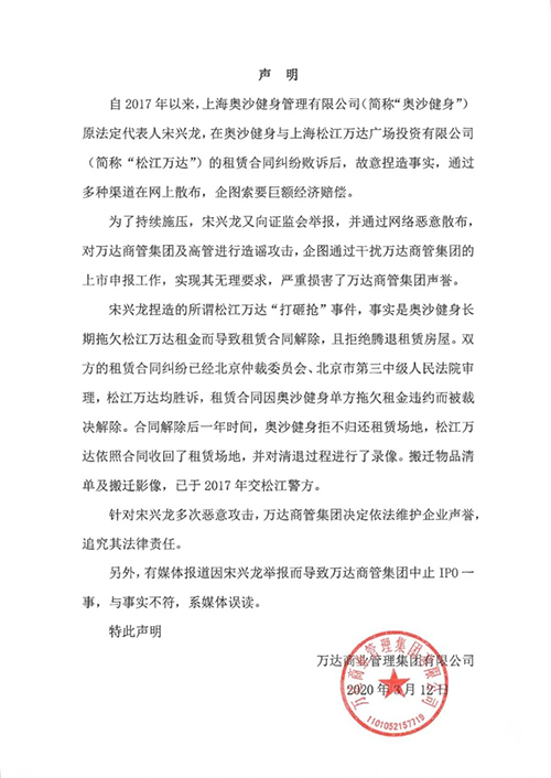 房訊網(wǎng)訊 3月12日,萬(wàn)達(dá)商業(yè)管理集團(tuán)有限公司發(fā)布聲明稱(chēng),自2017年以來(lái),上海奧沙健身管理有限公司原法定代表人宋興龍,在奧沙健身與上海松江萬(wàn)達(dá)廣場(chǎng)投資有限公司的租賃合同糾紛敗訴后,故意捏造事實(shí),通過(guò)多種渠道在網(wǎng)上散布,企圖索要巨額經(jīng)濟(jì)賠償。