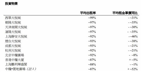 房訊網(wǎng)訊 4月23日,大悅城地產(chǎn)發(fā)布一季度未經(jīng)審核營運(yùn)數(shù)據(jù)。一季度,集團(tuán)投資物業(yè)平均出租率在87%以上,西單大悅城出租率最高,為99%;12個(gè)投資物業(yè)中,有10個(gè)平均租金單價(jià)同比下降,香港中糧大廈和中糧·置地廣場同比上升。