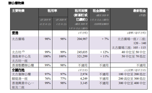中國內(nèi)地,太古匯辦公樓租用率達97%,頤堤港一座租用率達77%;香港興業(yè)中心一座及二座租用率達98%。零售物業(yè)方面,中國香港地區(qū),太古廣場購物商場、太古城中心、東薈城名店倉,租用率分別達100%、100%、99%,零售銷售額分別下降48.3%、20.5%、 33.6%。