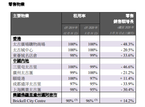 中國內(nèi)地,三里屯太古里、廣州太古匯購物商場、頤堤港購物商場、成都遠洋太古里及上海興業(yè)太古匯租用率分別達99%、100%、97%、95%、95% ,零售銷售額分別增長-46.6%、-21.2%、 11.4%、-33.9%及-30.4%。
