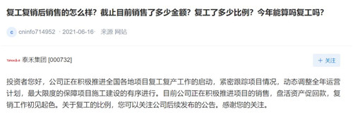 6月18日,有投資者在投資互動平臺上向泰禾集團(tuán)咨詢關(guān)于復(fù)工復(fù)銷后銷售情況等問題。對此,泰禾方面回應(yīng)稱,公司正在積極推進(jìn)全國各地項目復(fù)工復(fù)產(chǎn)工作的啟動,緊密跟蹤項目情況,動態(tài)調(diào)整全年運(yùn)營計劃,最大限度的保障項目施工建設(shè)的有序進(jìn)行。目前公司正在積極推進(jìn)項目的銷售,盤活資產(chǎn)促回款,復(fù)銷工作初見起色。