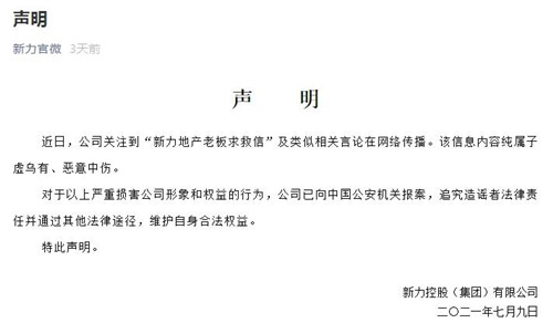 房訊網(wǎng)訊 7月9日,新力地產(chǎn)集團發(fā)布一則辟謠聲明稱,近日,新力地產(chǎn)集團關注到“新力地產(chǎn)老板求救信”及類似相關言論在網(wǎng)絡傳播。該信息內容純屬子虛烏有、惡意中傷。對于以上嚴重損害公司形象和權益的行為,公司已向中國公安機關報案,追究造謠者法律責任并通過其他法律途徑,維護自身合法權益。