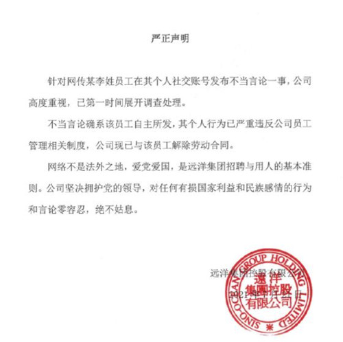 房訊網(wǎng)訊 7月21日,遠洋集團在官方微博發(fā)布嚴正聲明,稱針對網(wǎng)傳某李姓員工在其個人社交賬號發(fā)布不當言論一事,公司已在第一時間展開調(diào)查。經(jīng)確認,不當言論確系該員工自主所發(fā),其行為嚴重違反公司員工管理相關制度,已與員工解除勞動合同。