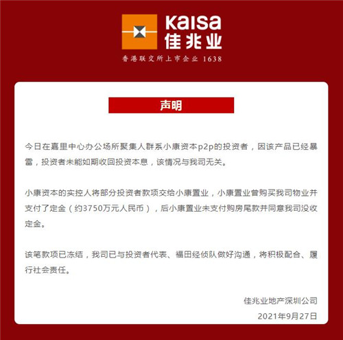 聲明顯示,小康資本的實控人將部分投資者款項交給小康置業(yè),小康置業(yè)曾購買佳兆業(yè)地產(chǎn)深圳公司物業(yè)并支付了定金約3750萬元,后小康置業(yè)未支付購房尾款并同意公司沒收定金。該筆款項已凍結(jié)在公司賬戶上,待經(jīng)偵部門下一步指示,按照法律法規(guī),公司將積極配合、履行社會責任與義務。