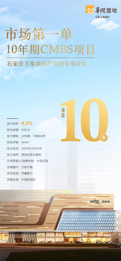 10月25日,華潤置地成功發(fā)行10年期“石家莊萬象城資產(chǎn)支持專項計劃(CMBS)”,發(fā)行規(guī)模30.01億元,發(fā)行利率4.0%,為市場第一單10年期CMBS,相對同業(yè)每3年重定價拆期CMBS優(yōu)勢明顯。