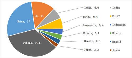 圖:2019年全球溫室氣體排放各國占比(%)