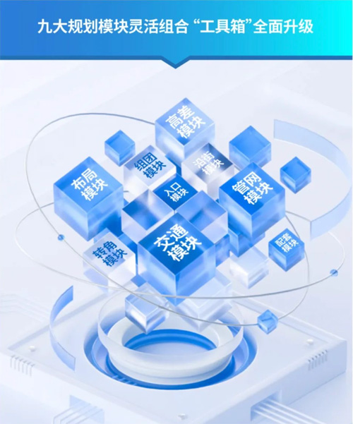 九大規(guī)劃模塊靈活組合"工具箱"全面升級(jí):布局模塊、交通模塊、組團(tuán)模塊、入口模塊、沿街模塊、轉(zhuǎn)角模塊、配套模塊、管網(wǎng)模塊、高差模塊。