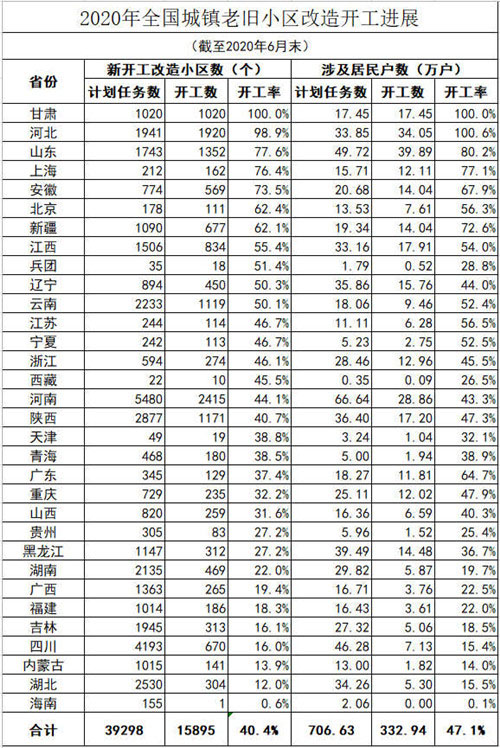 其中,甘肅省開(kāi)工率最高達(dá)100%,新開(kāi)工改造小區(qū)1020個(gè),涉及居民戶數(shù)17.45萬(wàn)人;海南開(kāi)工率最低,僅開(kāi)工1個(gè)小區(qū),新開(kāi)工改造小區(qū)開(kāi)工率為0.6%。隨著全國(guó)大部分地區(qū)進(jìn)入施工黃金期,疫情防控也進(jìn)入常態(tài)化,城鎮(zhèn)老舊小區(qū)改造進(jìn)度將明顯加快。
