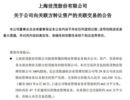 房訊網(wǎng)訊 12月13日,世茂股份發(fā)布關(guān)聯(lián)交易公告,公司擬將所屬的物業(yè)管理業(yè)務(wù)相關(guān)公司、資產(chǎn)、負(fù)債和業(yè)務(wù)全部出售給關(guān)聯(lián)方世茂服務(wù)控股有限公司,本次交易涉及包括世茂物業(yè)管理有限公司100%股權(quán)、北京茂悅盛欣企業(yè)管理有限公司等29家公司涉及的物業(yè)管理業(yè)務(wù)以及相關(guān)的資產(chǎn)負(fù)債,交易轉(zhuǎn)讓價(jià)格為人民幣165,350萬元。