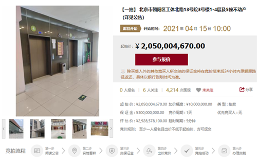 房訊網(wǎng)訊 據(jù)北京產(chǎn)權(quán)交易所披露,北京市朝陽區(qū)工體北路13號院3號樓1-4層及5幢不動(dòng)產(chǎn)(世茂工三)將于4月15日在北交互聯(lián)網(wǎng)絡(luò)司法拍賣平臺上進(jìn)行公開拍賣,評估價(jià)為29.29億元,起拍價(jià)為20.5億元。