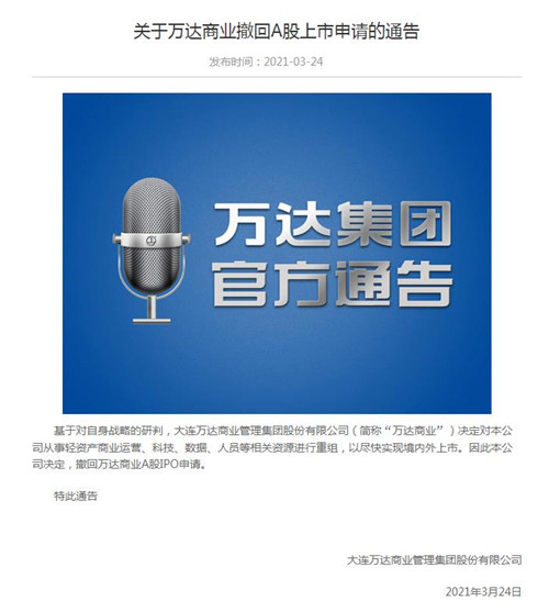 房訊網訊 3月24日,萬達集團官網發(fā)布《關于萬達商業(yè)撤回A股上市申請的通告》。