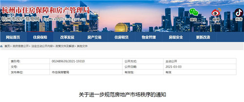 房訊網(wǎng)訊 3月3日,杭州市住保房管局發(fā)布《關于進一步規(guī)范房地產(chǎn)市場秩序的通知》,從進一步加強住房限購、嚴格防范經(jīng)營貸、消費貸違規(guī)流入房地產(chǎn)市場、嚴厲打擊房地產(chǎn)中介機構違法違規(guī)行為、嚴格規(guī)范房地產(chǎn)市場信息發(fā)布四個方面加強房地產(chǎn)市場調(diào)控。