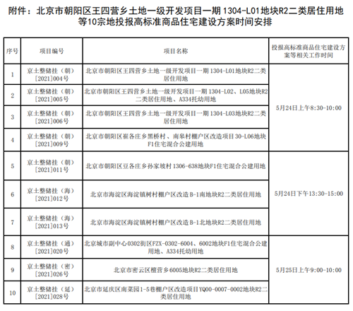 房訊網(wǎng)訊 5月18日,北京市規(guī)劃和自然資源委員會發(fā)布通知,此前10宗轉入投報高標準商品住宅建設方案的地塊將分三批次投報,分別為24日上午、24日下午及25日上午,各相關競買人提前做好準備,按時間要求提前到達豐臺區(qū)西三環(huán)南路1號市公共資源交易綜合分平臺五層,參加投報高標準商品住宅建設方案活動。因競買人延遲到場而產(chǎn)生的一切責任由競買人自行承擔。