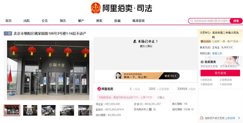 房訊網(wǎng)訊 據(jù)阿里拍賣顯示,9月9日上午10時,北京樂融大廈(原樂視大廈)再次拍賣,評估價為8.18億元,起拍價為5.7億元,較上次拍賣降價1億元。本次拍賣有1人報(bào)名參拍,33萬余人次圍觀,然而,因案外人對拍賣財(cái)產(chǎn)提出異議,拍賣隨后就被中止。