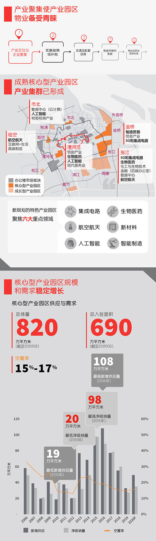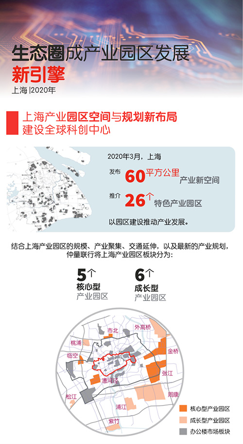 2020年3月,上海瞄準(zhǔn)科技前沿,在現(xiàn)有規(guī)劃的基礎(chǔ)上,發(fā)布60平方公里產(chǎn)業(yè)新空間并推介26個(gè)特色產(chǎn)業(yè)園區(qū),以園區(qū)建設(shè)推動(dòng)產(chǎn)業(yè)發(fā)展。憑借清晰的產(chǎn)業(yè)規(guī)劃和30余年的發(fā)展歷程,上海產(chǎn)業(yè)園區(qū)已成為上海商業(yè)房地產(chǎn)市場(chǎng)中重要的組成部分。在多年政策引導(dǎo)下,上海產(chǎn)業(yè)園區(qū)內(nèi)尤其是核心型產(chǎn)業(yè)園區(qū),云集了眾多新興科技行業(yè)里的優(yōu)質(zhì)企業(yè),已形成產(chǎn)業(yè)聚集效應(yīng)。