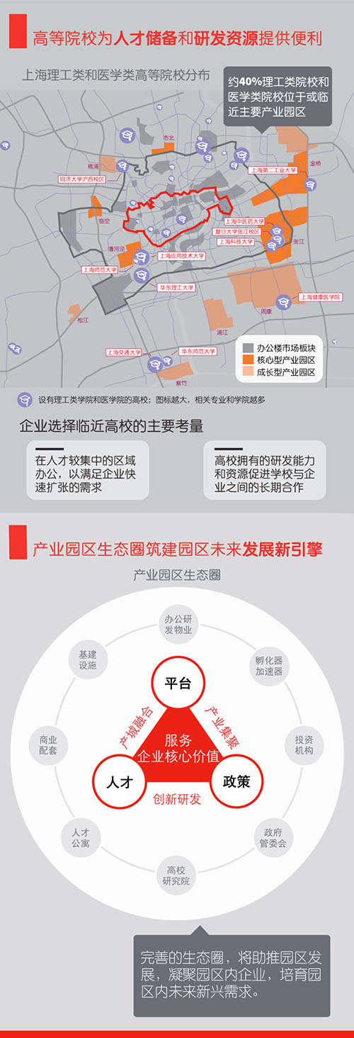憑借產(chǎn)業(yè)園區(qū)內(nèi)的資源及優(yōu)勢(shì),產(chǎn)業(yè)園區(qū)以創(chuàng)新為引擎,以人才為驅(qū)動(dòng),強(qiáng)化資源配置,構(gòu)筑起由企業(yè)、物業(yè)業(yè)主、政府、高校等共同參與的產(chǎn)業(yè)園區(qū)生態(tài)圈。長(zhǎng)遠(yuǎn)來(lái)看,完善的生態(tài)圈將助推園區(qū)發(fā)展,凝聚園區(qū)內(nèi)企業(yè),培育園區(qū)內(nèi)未來(lái)多元化的辦公空間新需求。