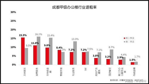 疫情沖擊各行各業(yè),除與風(fēng)險(xiǎn)存在對(duì)沖關(guān)系的醫(yī)藥、科技互聯(lián)網(wǎng)等行業(yè)外,諸多企業(yè)生存壓力增大,優(yōu)勝劣汰加劇。自3月起,全行業(yè)退租現(xiàn)象頻繁,上半年非傳統(tǒng)金融業(yè)退租率更是高達(dá)24.4%。進(jìn)入三季度后,成都市場退租現(xiàn)象開始放緩,總退租面積較二季度下降28.5%。而消費(fèi)服務(wù)、文體娛樂、非傳統(tǒng)金融仍為主要退租行業(yè),退租率分別為15.5%、11.0%和9.8%。疫情加速行業(yè)內(nèi)調(diào)整,兼并購以及破產(chǎn)重組事件多發(fā),引致專業(yè)服務(wù)企業(yè)業(yè)務(wù)開始上揚(yáng),其中律師事務(wù)所更是從中獲益,季度內(nèi)錄得其新租面積超1萬平方米。