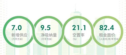 第三季度,市場錄得成華萬科大廈的交付。需求延續(xù)回暖態(tài)勢,凈吸納量居全國第四,錄得約9.5萬平方米,環(huán)比上漲32.9%,為去年同期的七成;甲級寫字樓凈吸納量約4萬平方米,環(huán)比上漲210.2%,為去年同期的六成。一方面大中型企業(yè)的租賃需求明顯升溫;另一方面部分企業(yè)抓住租金調(diào)整窗口期升級、擴租,分別占比季內(nèi)辦公策略的24.3%、18.0%。相應(yīng)地,市場整體空置率環(huán)比下降0.5個百分點至21.1%;平均賬面租金環(huán)比下跌0.4%至每月每平方米82.4元,跌幅收窄0.7個百分點。