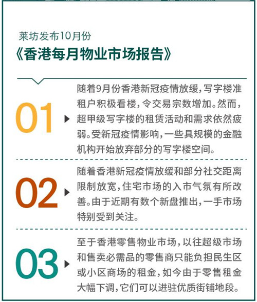 隨著9月份新冠疫情放緩,寫字樓準(zhǔn)租戶積極地看樓,令交易宗數(shù)增加。本月新租賃個案集中在價錢合理中小型的甲級寫字樓,大部分為面積3,000平方英尺以下,租金有吸引力的辦公空間。