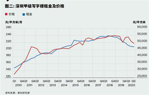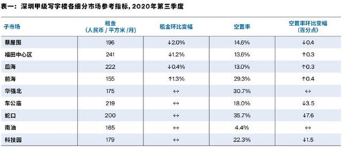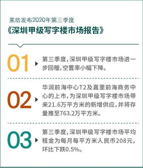 經(jīng)濟(jì)的向好發(fā)展也帶動了深圳甲級寫字樓市場的進(jìn)一步復(fù)蘇,寫字樓市場進(jìn)一步去化。2020年第三季度,深圳甲級寫字樓市場的空置率環(huán)比小幅下跌0.3個百分點至18.4%,跌幅環(huán)比收窄0.5個百分點。受空置率依然高企的影響,深圳甲級寫字樓市場平均租金環(huán)比下跌0.5%至每月每平方米人民幣208元。租金的下跌趨勢也促進(jìn)了優(yōu)質(zhì)企業(yè),尤其是專業(yè)服務(wù)類及T M T類企業(yè),積極尋求搬遷或擴(kuò)張的機(jī)會!