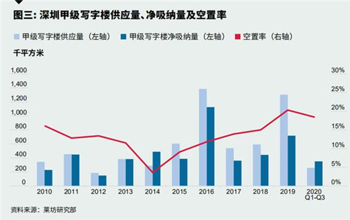 2020年第三季度,華潤前海中心T2及嘉里前海商務(wù)中心交付上市,帶來21.6萬平方米的新增供應(yīng)。深圳甲級寫字樓市場存量上升至763.2萬平方米,凈吸納量為19.8萬平方米。