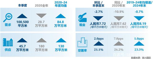 隨著宏觀經(jīng)濟的復(fù)蘇和市場信心的恢復(fù),上海寫字樓市場租賃需求在第三季度已回升至2019年疫情前的正常水平。上半年受疫情影響有部分新增供應(yīng)推遲入市,致三季度有7個新項目集中入市,整體供應(yīng)量達(dá)45.7萬平方米;大量新增供應(yīng)將整體空置率推升2個百分點至21.1%;租金小幅下降,但跌幅開始放緩,第三季度上海寫字樓平均租金7.72元每平方米每天,環(huán)比下降2.7%。