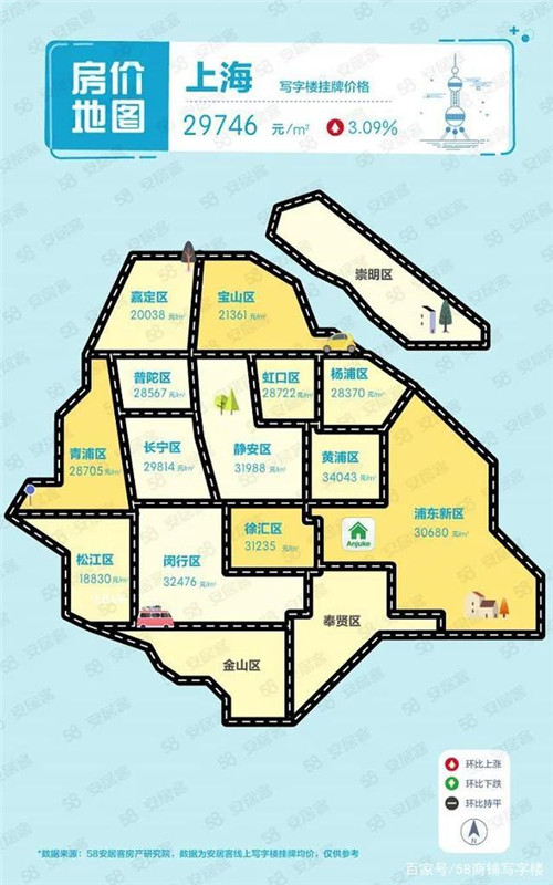58同城、安居客線上掛牌數(shù)據(jù)顯示,三季度上海寫字樓掛牌價格為29746元/㎡,環(huán)比上漲3.09%,在一線城市中表現(xiàn)最為突出。