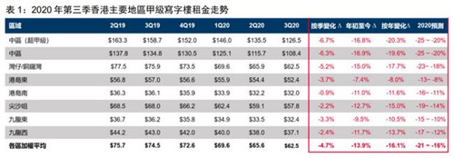 在空置率壓力下,租金也連續(xù)第六個(gè)季度下跌,沒(méi)有區(qū)域例外,中區(qū)及灣仔/銅鑼灣區(qū)跌幅最大,環(huán)比分別下跌6.3%及5.2%,同比分別下跌16.9%及15.0%,預(yù)計(jì)全年跌幅可分別達(dá)25%及23%。