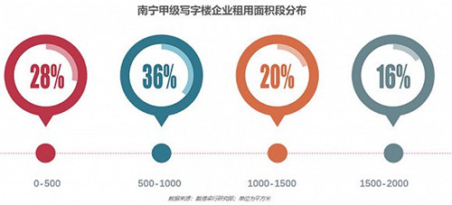 從2019年需求結(jié)構(gòu)來看,在房地產(chǎn)市場(chǎng)熱度較高的當(dāng)下,建筑業(yè)與房地產(chǎn)業(yè)成為南寧寫字樓市場(chǎng)的核心客群,二者租賃成交面積占比分別為32%、25%,相加接近六成;而專業(yè)服務(wù)業(yè)、TMT、金融業(yè)則分別占比12%、9%、9%,該行業(yè)構(gòu)成與多數(shù)一線城市及重點(diǎn)二線城市相去甚遠(yuǎn)。未來,作為帶動(dòng)經(jīng)濟(jì)發(fā)展重要?jiǎng)恿Φ腡MT、金融業(yè)、專業(yè)服務(wù)業(yè)在南寧仍有著巨大的發(fā)展空間。此外,全年租賃成交中鮮見總部企業(yè)和外資企業(yè),可見當(dāng)前南寧商務(wù)市場(chǎng)對(duì)此類客戶的吸引力仍然有限,這也是未來在城市發(fā)展、政策支持等的促進(jìn)下可改善的一大方向,如總部型企業(yè)的引進(jìn)不僅可以大體量去化辦公物業(yè),還有助于集聚上下游關(guān)聯(lián)企業(yè),促進(jìn)產(chǎn)業(yè)鏈的完善。通過企業(yè)租用甲級(jí)寫字樓辦公空間面積段分布分析,租用1000平方米(含)及以下甲級(jí)寫字樓辦公空間的企業(yè)數(shù)量占比達(dá)64%,反映了中小型企業(yè)是現(xiàn)階段南寧甲級(jí)寫字樓租賃市場(chǎng)的主要客群,同時(shí)亦有部分大型企業(yè)的區(qū)域分支租用。