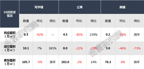 合富大數(shù)據(jù)顯示,10月廣州商業(yè)市場整體新增供應環(huán)比大幅減少,寫字樓及商鋪僅有零星新增供應,環(huán)比降幅均超9成,同比去年基本持平,公寓新增供應環(huán)比下降超8成,但同比去年大幅上升;成交方面,寫字樓由于大手交易支撐,10月成交有所上升,公寓及商鋪成交有所回落,公寓下降超2成,商鋪環(huán)比降幅近5成。庫存方面,整體庫存量基本持平并有減少的趨勢。