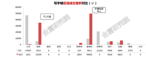 合富大數(shù)據(jù)顯示,10月全市寫字樓成交量為101413㎡,同比上升365%,環(huán)比9月份上升7%,由于大手交易較暢旺,9-10月市場保持強勢狀態(tài)。10月寫字樓新增供應僅3000㎡,環(huán)比9月下降超9成,主要來自海珠區(qū)琶洲板塊的國美智慧城部分樓層。