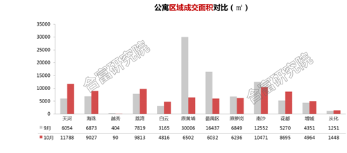 成交分布方面,雖然整體成交量環(huán)比下降,但實際上對比9月,大多數(shù)區(qū)域呈現(xiàn)上升的趨勢,僅原黃埔、番禺環(huán)比下降幅度較大。10月銷售榜單項目全部來自品牌開發(fā)商,越秀、碧桂園、合景均有2個以上項目進入榜單。位于市區(qū)的項目較往期多,不乏價格超6萬元的江景大平層產品,在渠道帶動下成交較好。