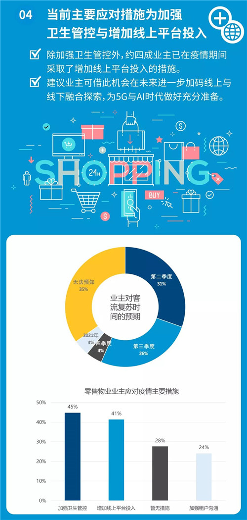 3、超四成的零售物業(yè)業(yè)主與超一半的租戶在疫情期間加大了線上平臺(tái)投入。業(yè)主與租戶可就此共同制定策略,相互配合以擴(kuò)大線上銷售。