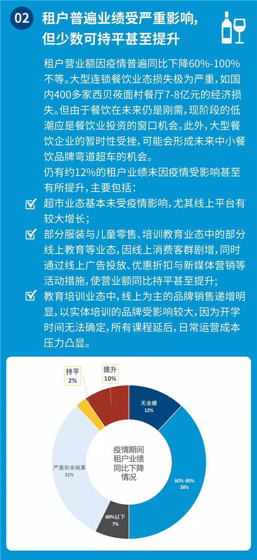 5、餐飲企業(yè)租戶在本次疫情中受創(chuàng)嚴(yán)重,尤其大型連鎖餐飲。我們建議餐飲租戶在當(dāng)下可與業(yè)主共同打通線上平臺(tái),加大外賣與企業(yè)配餐的業(yè)務(wù),并借此形成未來(lái)新的發(fā)展策略。同時(shí)加強(qiáng)對(duì)防疫衛(wèi)生工作的宣傳,消除消費(fèi)者疑慮。此外,餐飲將是疫情結(jié)束后消費(fèi)者報(bào)復(fù)性消費(fèi)的主要業(yè)態(tài),我們建議餐飲租戶應(yīng)提前做好準(zhǔn)備。