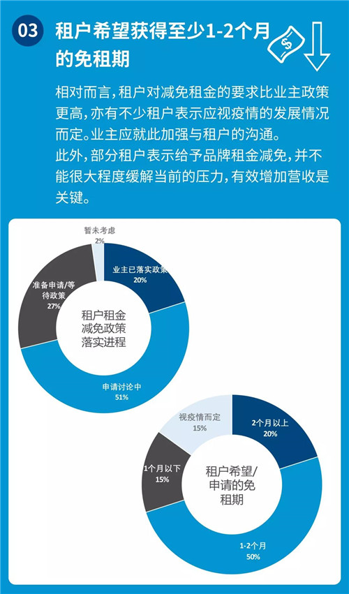 但調(diào)查顯示多數(shù)租戶希望獲得至少1-2個(gè)月的免租期,亦有不少租戶表示應(yīng)視疫情的發(fā)展情況而定。業(yè)主應(yīng)就此加強(qiáng)與租戶的溝通。
