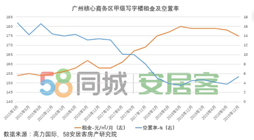 得益于廣州GDP及第三產(chǎn)業(yè)的較高增速,2019年廣州前三季度寫字樓需求有較好支撐,第四季度珠江新城供應(yīng)集中入市使得空置率在年底提升至5.3%。相應(yīng)的,廣州核心商務(wù)區(qū)甲級寫字樓的租金維持穩(wěn)定,2019年第四季度微調(diào)至175元/㎡/月。其中,珠江新城租金最高,體育中心緊隨其后,其次是琶洲和越秀。