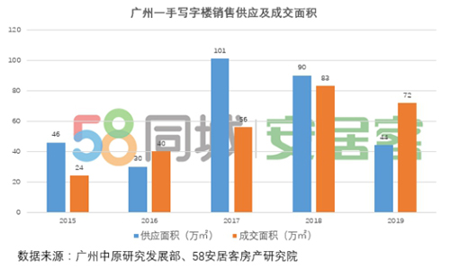 在寫字樓銷售層面,58同城、安居客《2019年廣州寫字樓現(xiàn)狀報告》顯示,2019年廣州一手寫字樓供應(yīng)量為1849套,共約44萬㎡。寫字樓成交呈現(xiàn)外移趨勢,魚珠板塊和白鵝潭板塊熱度提升。外圍四區(qū)中,花都迎賓大道板塊逆勢崛起,承包了廣州全年約22%的交易量。